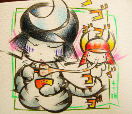 おしるこのお餅食べようとしたら必ずひこにゃんに取られるでござる(´;ω;`)(しまさこ談